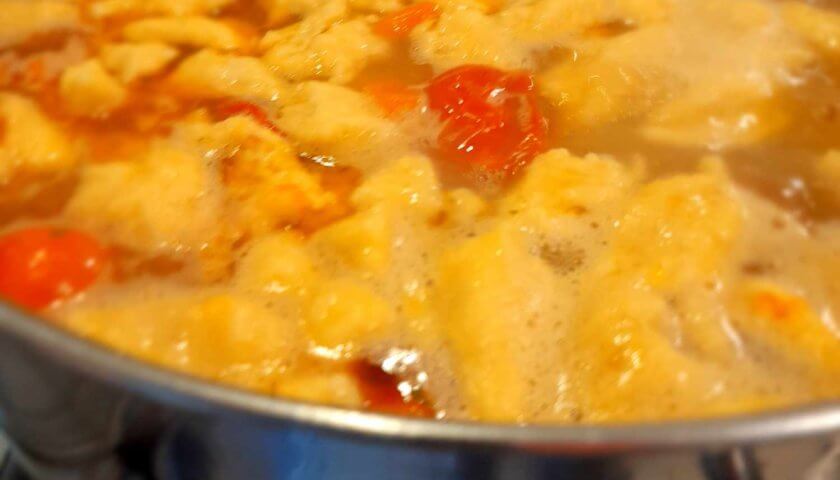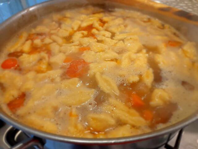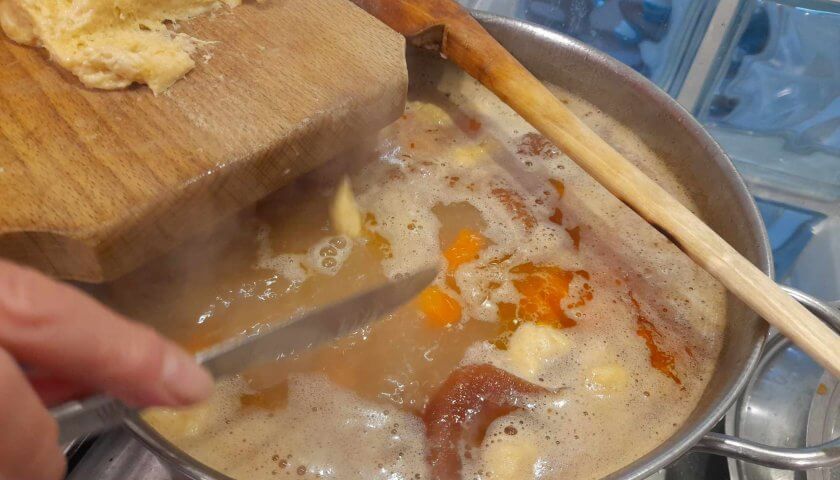 - Rupe bucăți mici de aluat și adaugă-le în oală în ultimele 10-15 minute de fierbere.