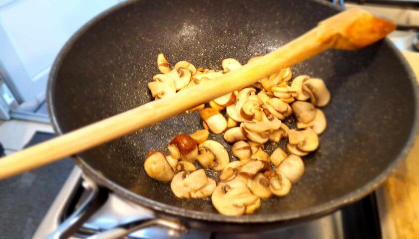 - Gătirea ciupercilor: Într-o tigaie mare, pune lingurița de untură la încins pe foc mediu. Adaugă ciupercile tăiate și lasă-le să se prăjească timp de 5-7 minute, amestecând din când în când, până când își schimbă culoarea și devin mai moi. Dacă îți place o aromă mai intensă, poți lăsa ciupercile să se rumenească ușor.