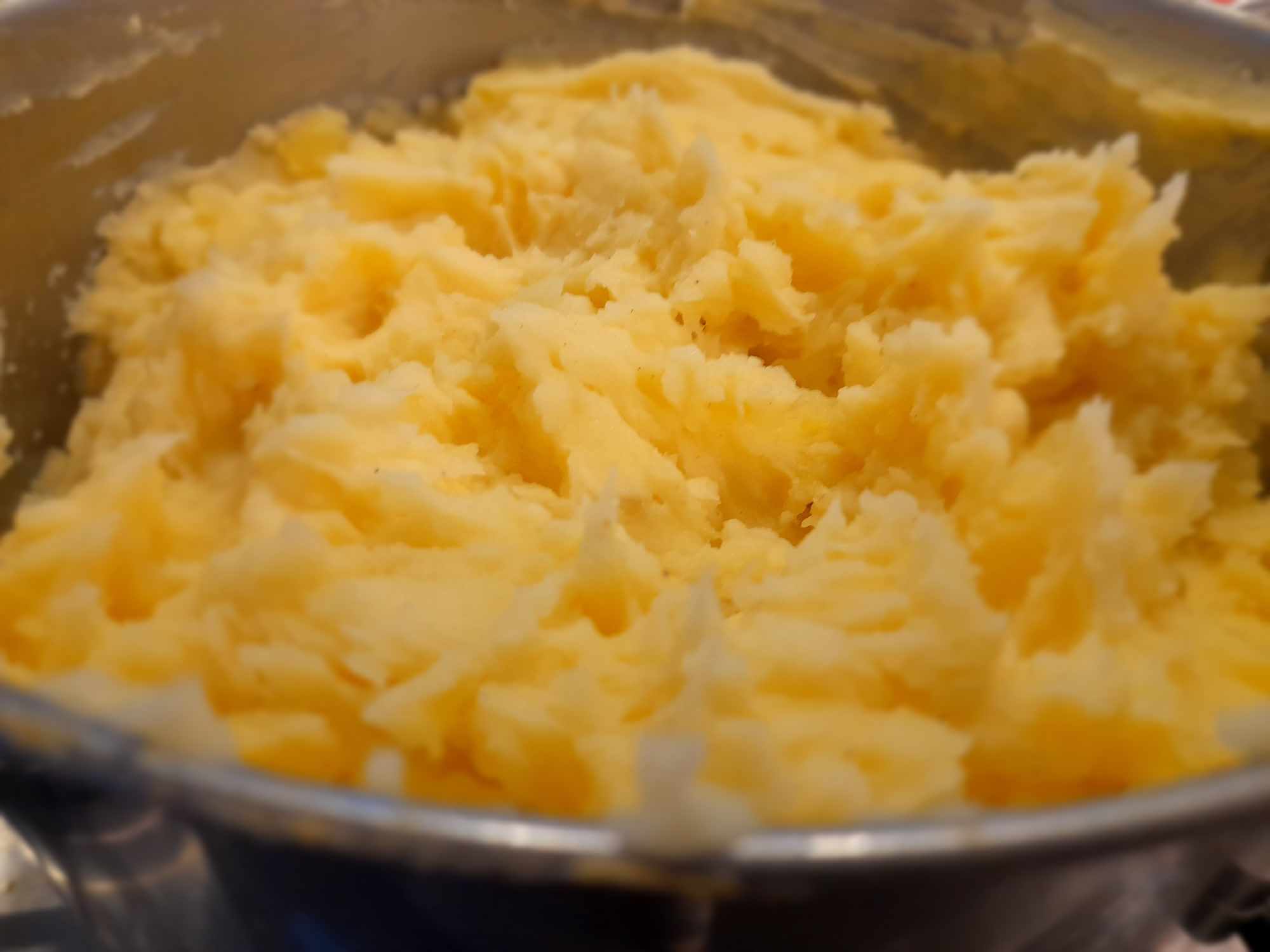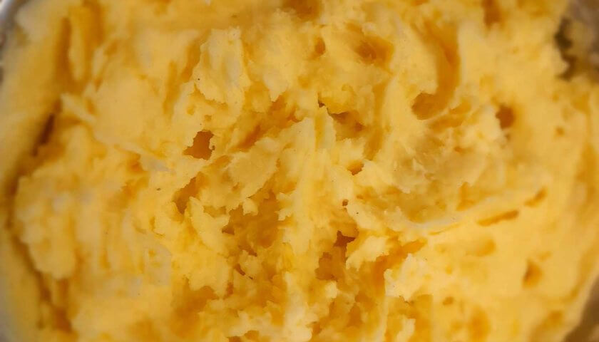 - Încorporează untura în piure cât timp cartofii sunt încă fierbinți, pentru a se topi ușor.