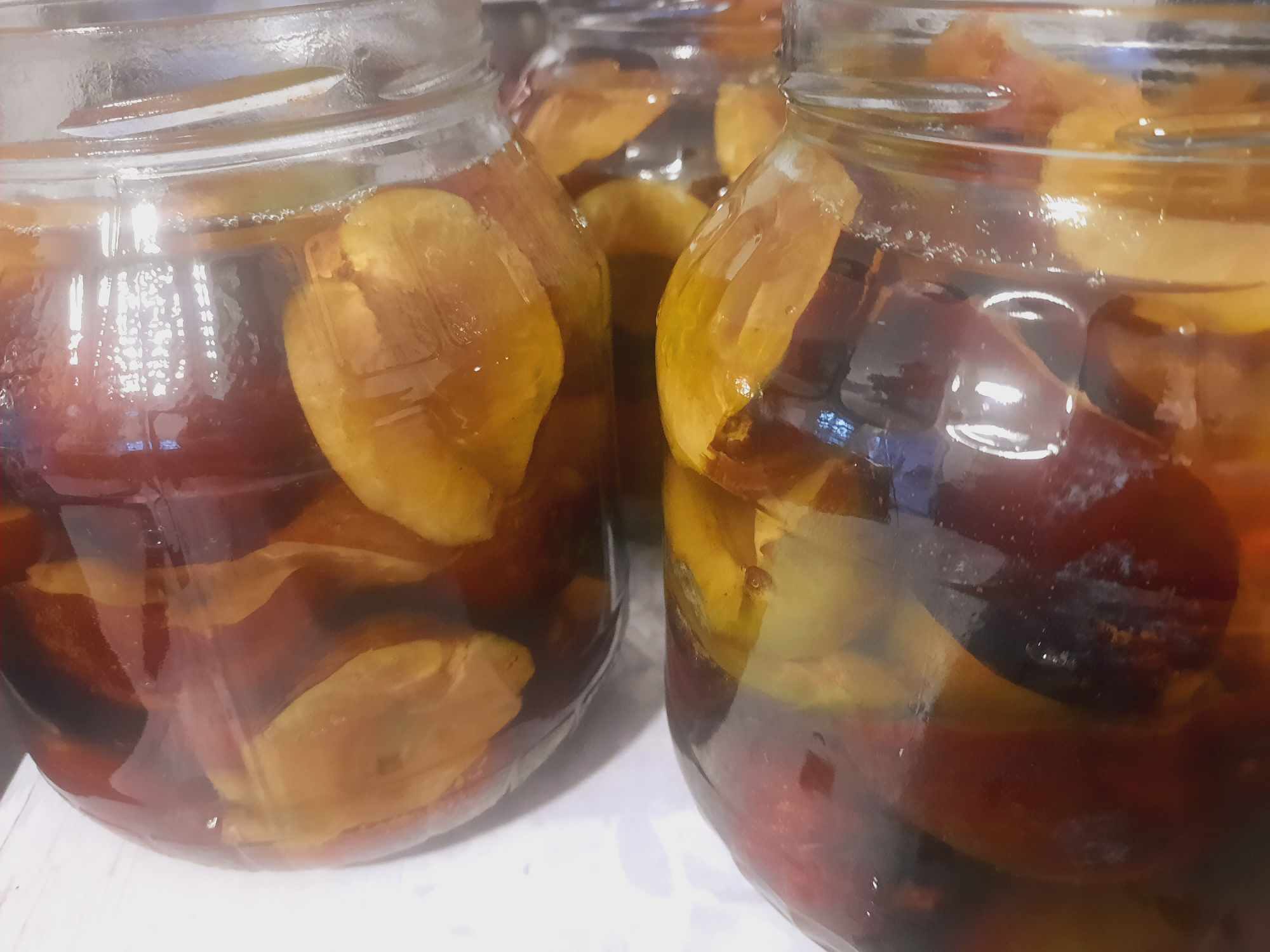 Turnați apa într-o cratiță, începeți să gătiți cu zahăr, sare, oțet, scorțișoară și cuișoare. Cand dă în clocot, puteți turna sucul peste prune, apoi lăsați să stea 10 minute, apoi turnatâți înapoi în oala. Se aduce din nou la fierbere și se distribuie din nou uniform peste fructe. Sigilați bine cu un capac și puneți între pături. După două-trei zile, sticlele pot merge în cămară.